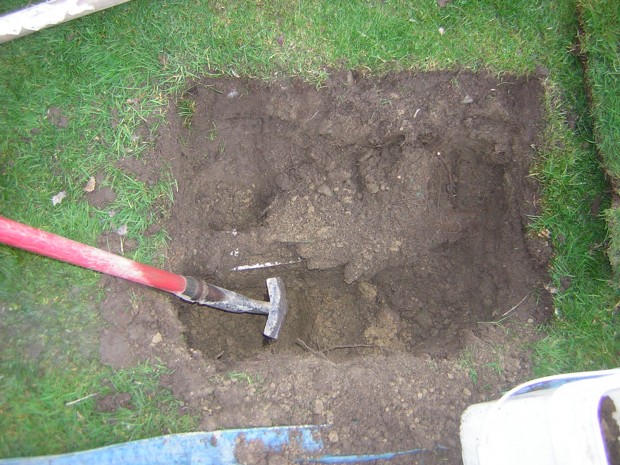 See how I dig a deep spot my shovel will fit into next to the double check? I can cave in dirt chiseling around the device and extract big scoops from this hole. This is how they rescued the Chilean miners. I think.