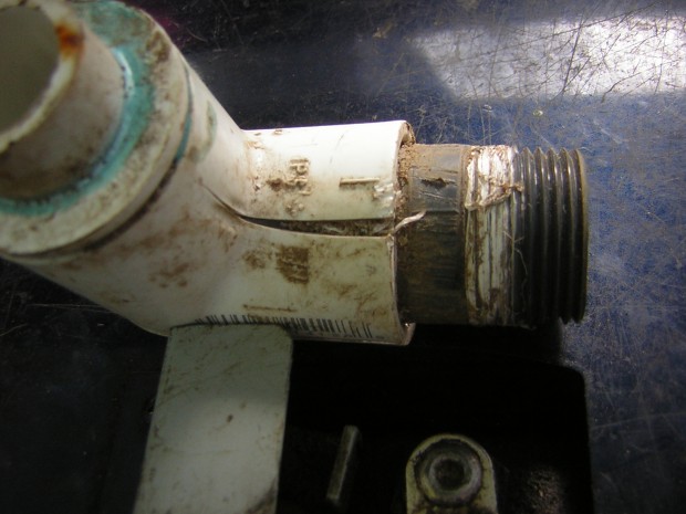 Look at this idiot muscle man’s work. There’s no reason to tighten a fitting so far that no threads are visible. Threaded pipe fittings are slightly wedge shaped- they gradually snug tighter at every turn. Use a few wraps of teflon, a dab of dope- if you’re a belt-and-suspenders type person, and tighten until snug enough just past hand-tight. No reason to reef on it with channel-locks like the teethmarks shown here.